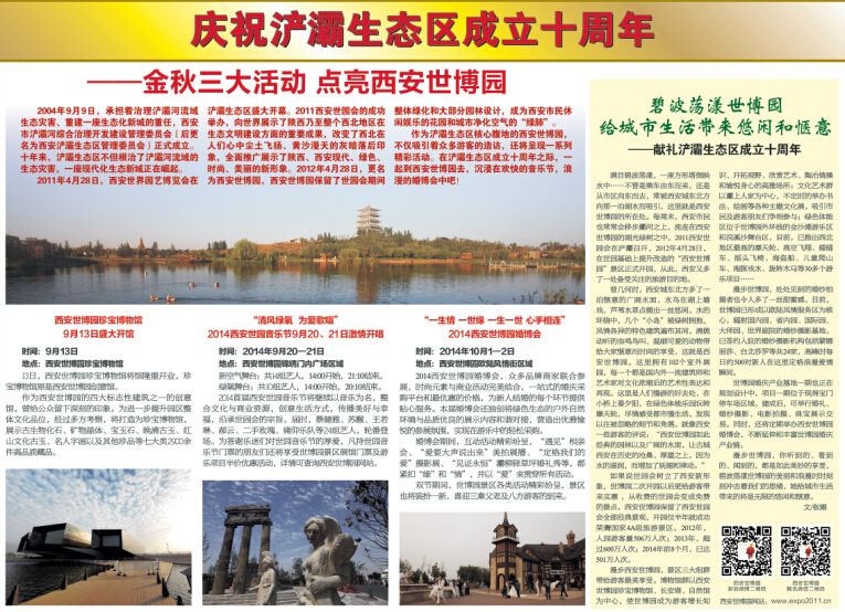 慶祝浐灞生態(tài)區成立十周年發(fā)表于:2014-09-11 瀏覽3556次——金秋三大活動(dòng)亮點(diǎn)世博園